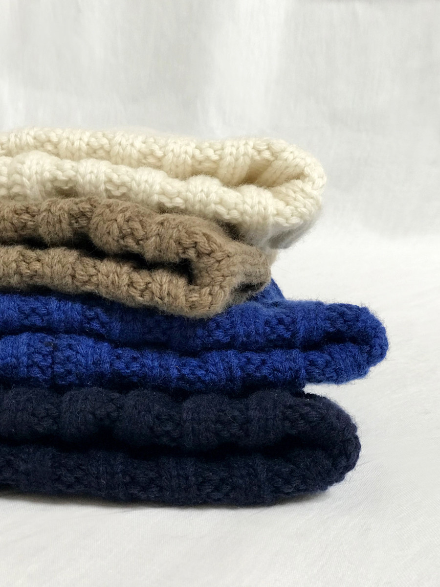 저렴하게 만든 비니들은 대개 소재도 아크릴 acrylic 위주일 뿐 아니라 만든 방법 자체도 다르지요. 일단 똑바로 짜올라가다가 절개를 해서 오버로크 봉제로 마무리하거나, 맨 꼭대기 부분에서 억지로 오므려 묶어버리는 방법을 택합니다. 그런 경우 겉으로 절개선이 보이고 속에는 두꺼운 시접이 여러 줄 생기거나 꼭대기 쪽 형태가 울퉁불퉁하고 만두 같은 주름이 잡히는 등 차이가 있다는 걸 알 수 있을 거예요.