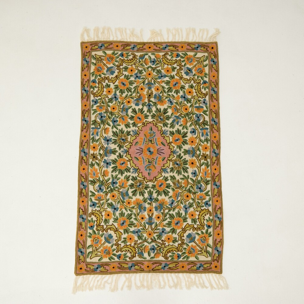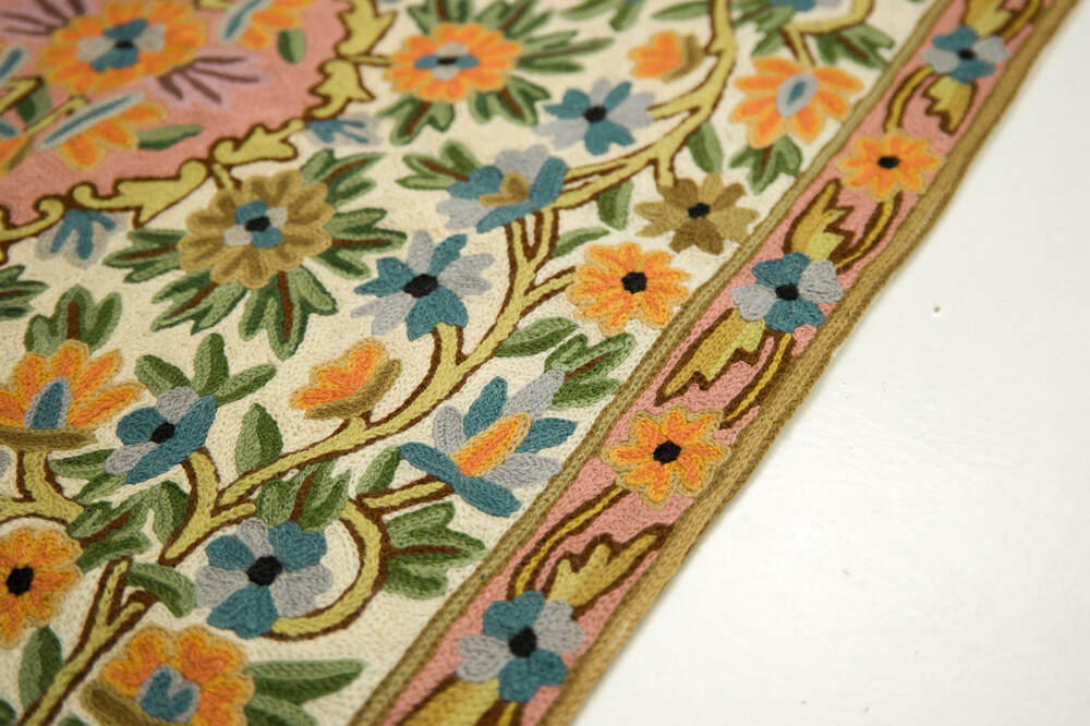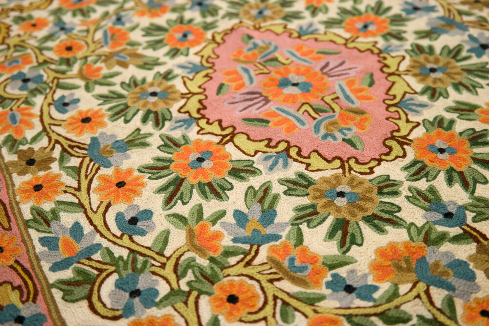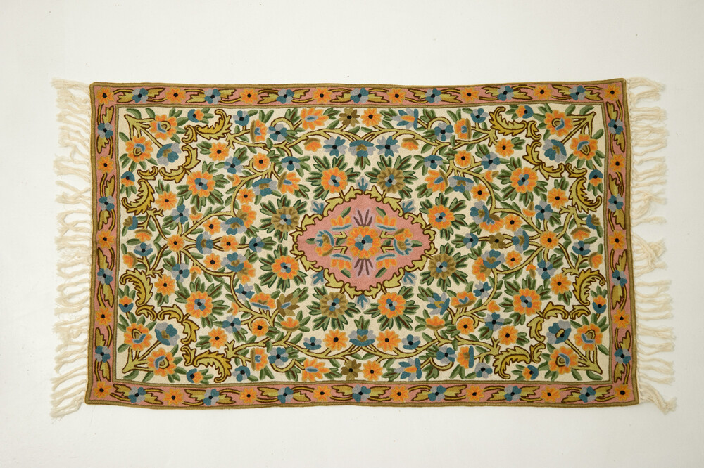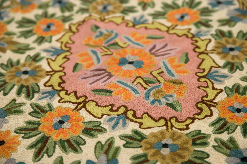 독보적인 디자인과 전통적인 자수 방식인 체인 스티치 기법이 결합된 아름다운 러그입니다.