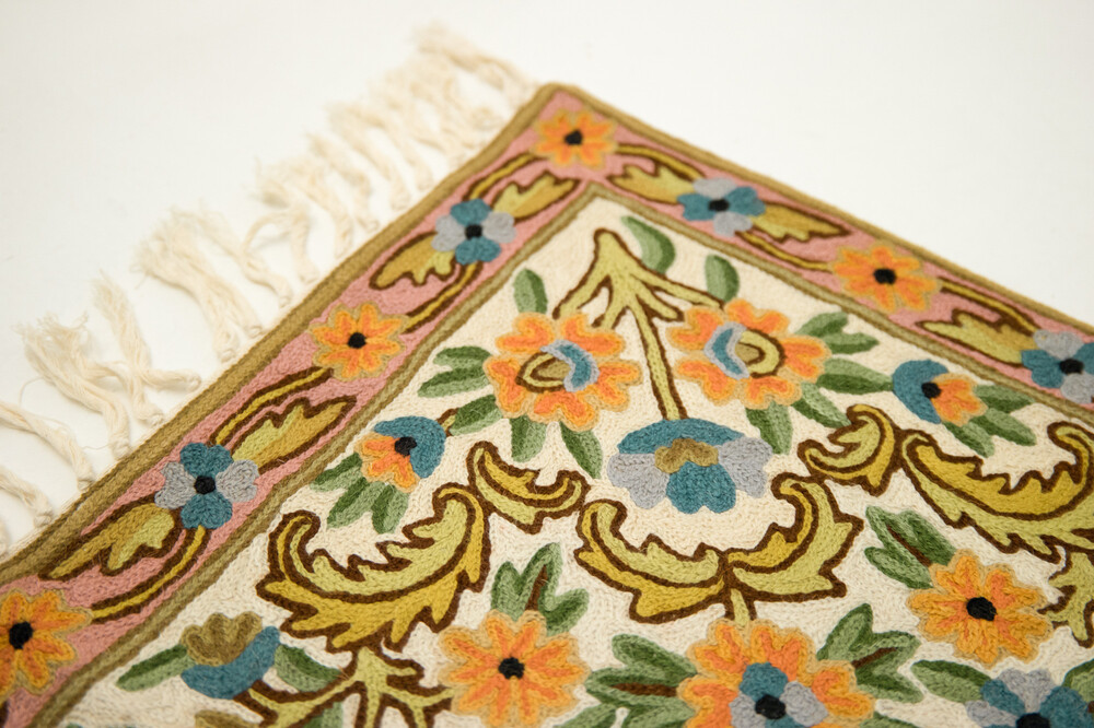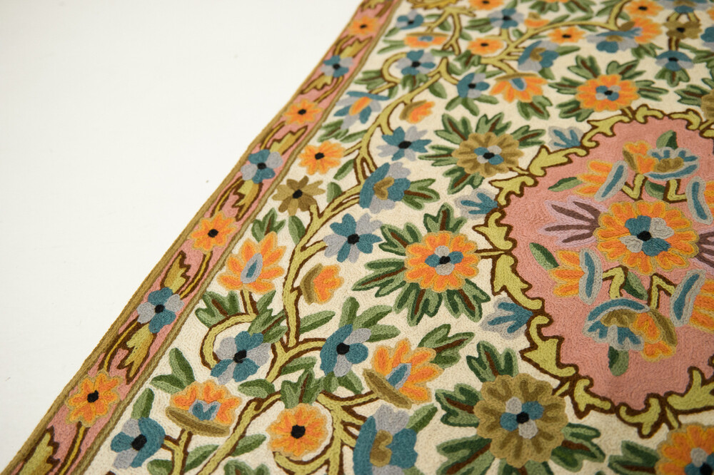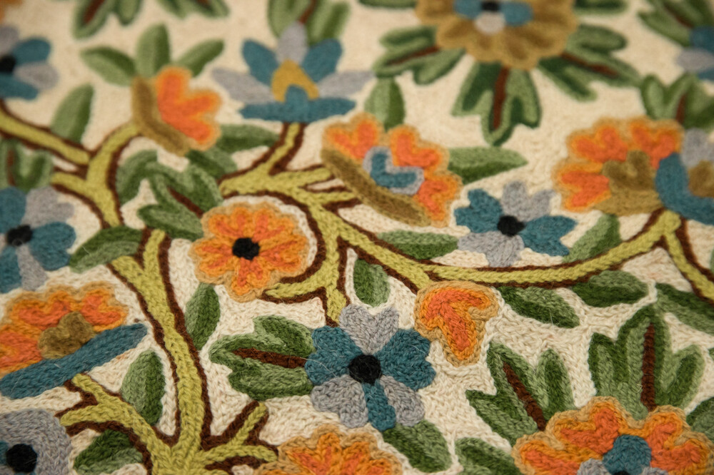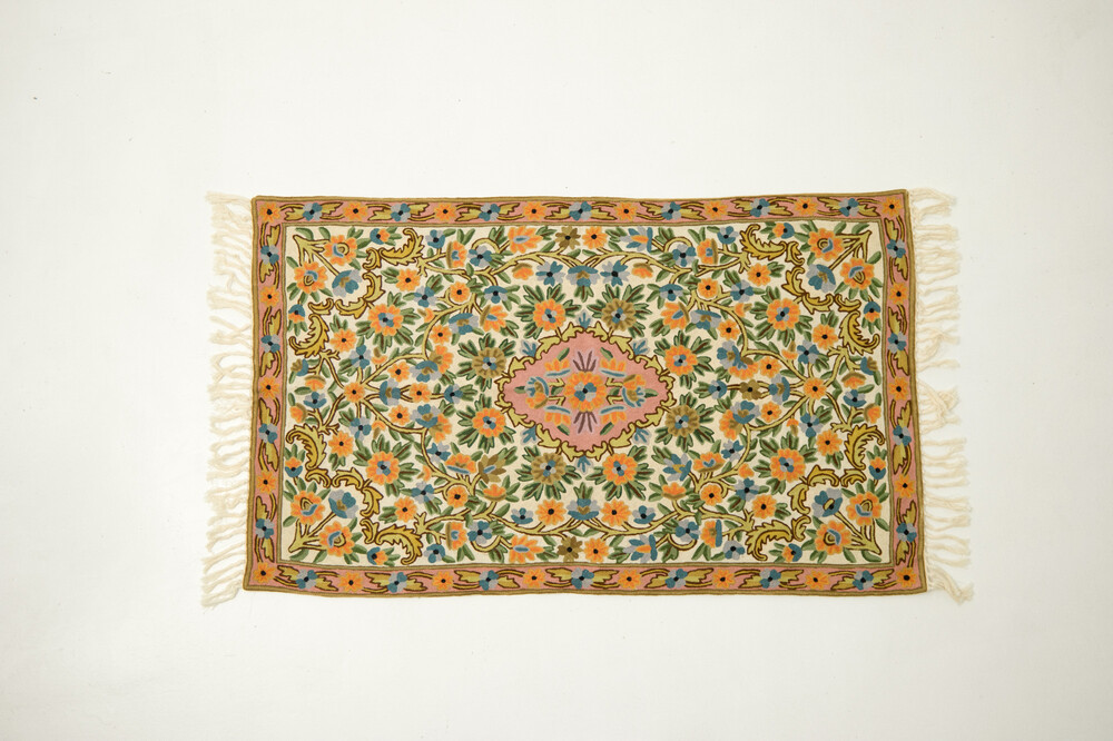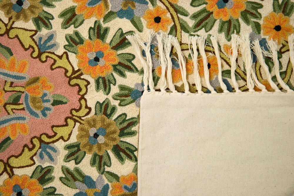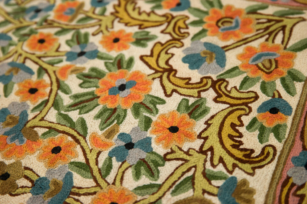 독보적인 디자인과 전통적인 자수 방식인 체인 스티치 기법이 결합된 아름다운 러그입니다.