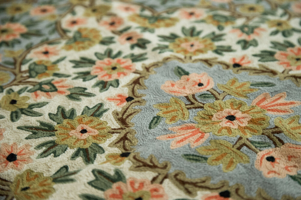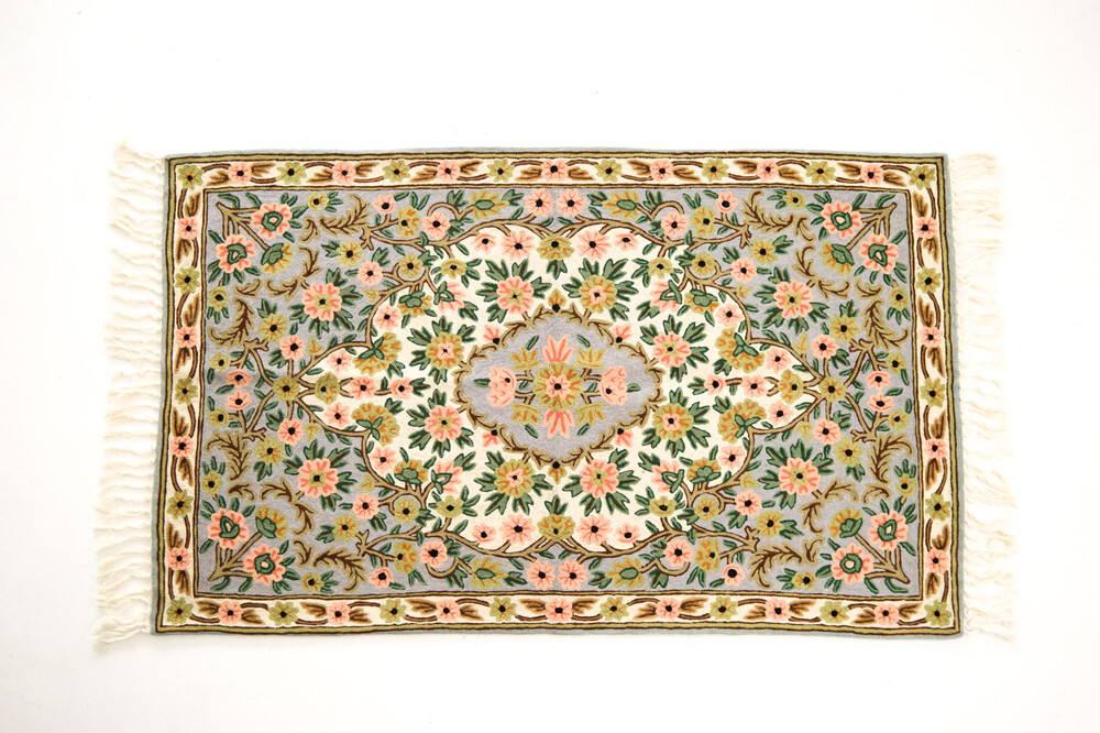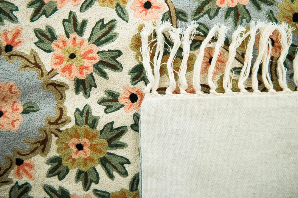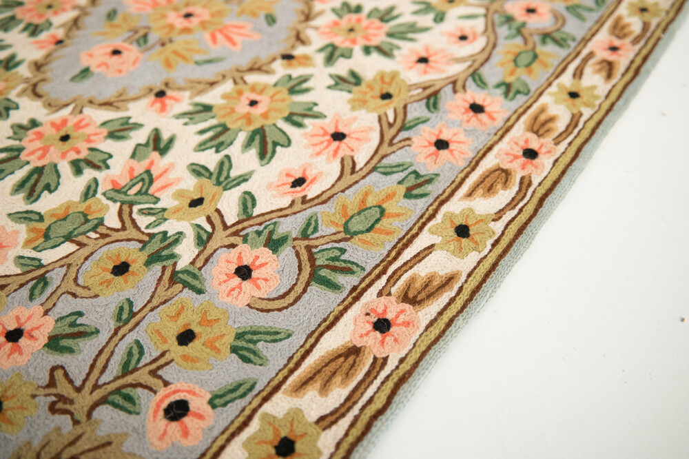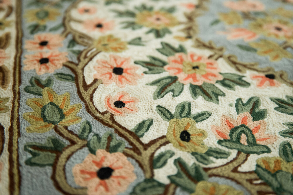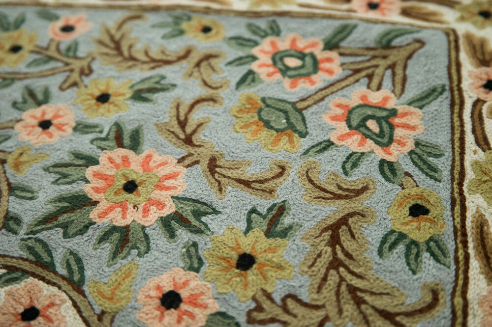 독보적인 디자인과 전통적인 자수 방식인 체인 스티치 기법이 결합된 아름다운 러그입니다.