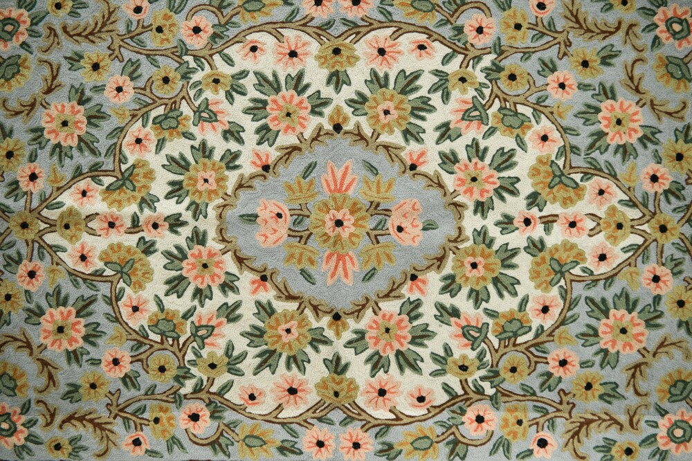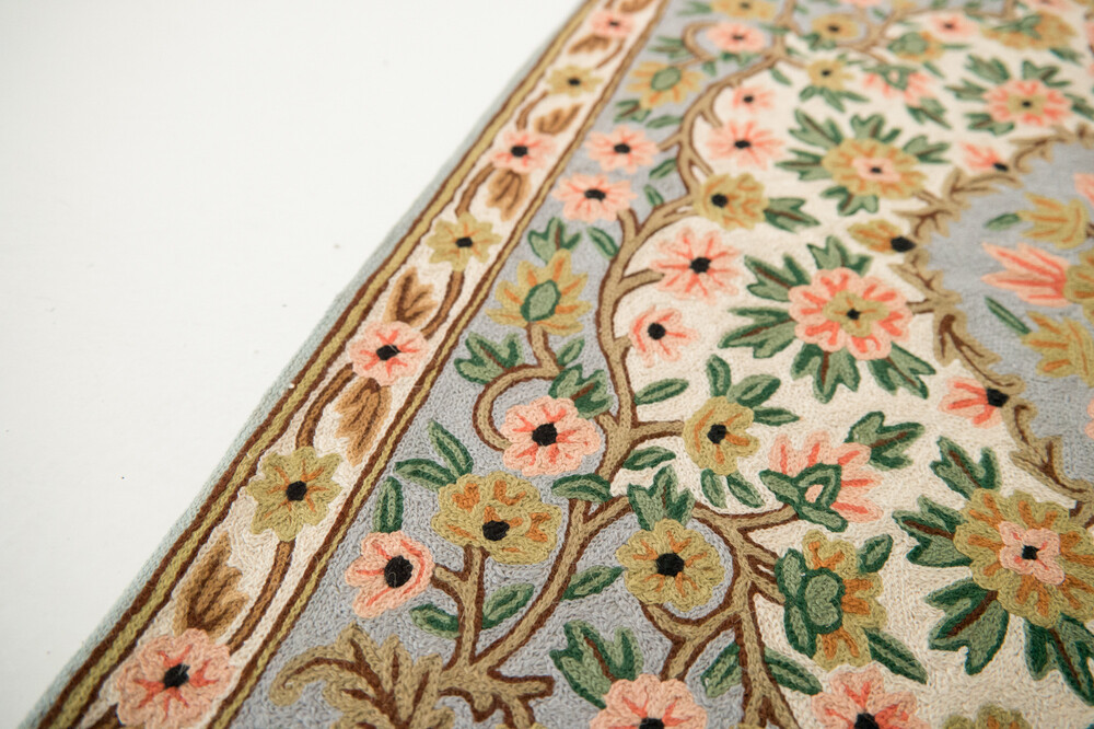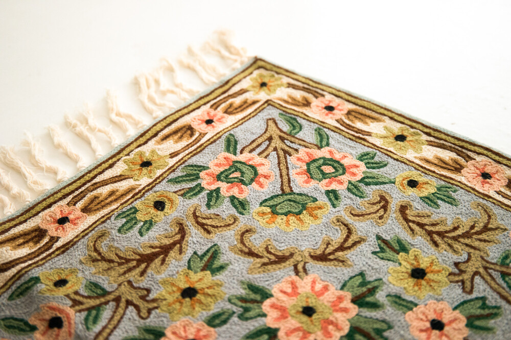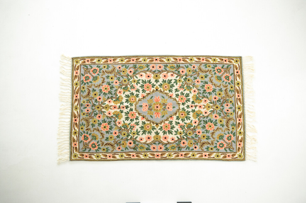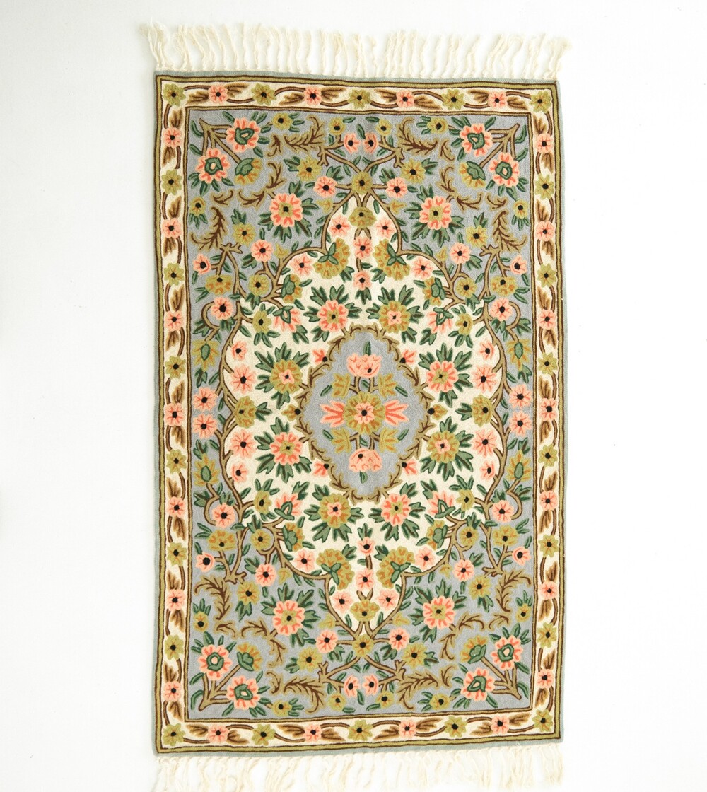 독보적인 디자인과 전통적인 자수 방식인 체인 스티치 기법이 결합된 아름다운 러그입니다.